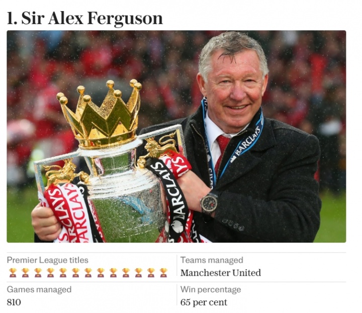 电讯报评英超历史十大主帅:弗格森第1,瓜帅第2,温格、穆帅三四