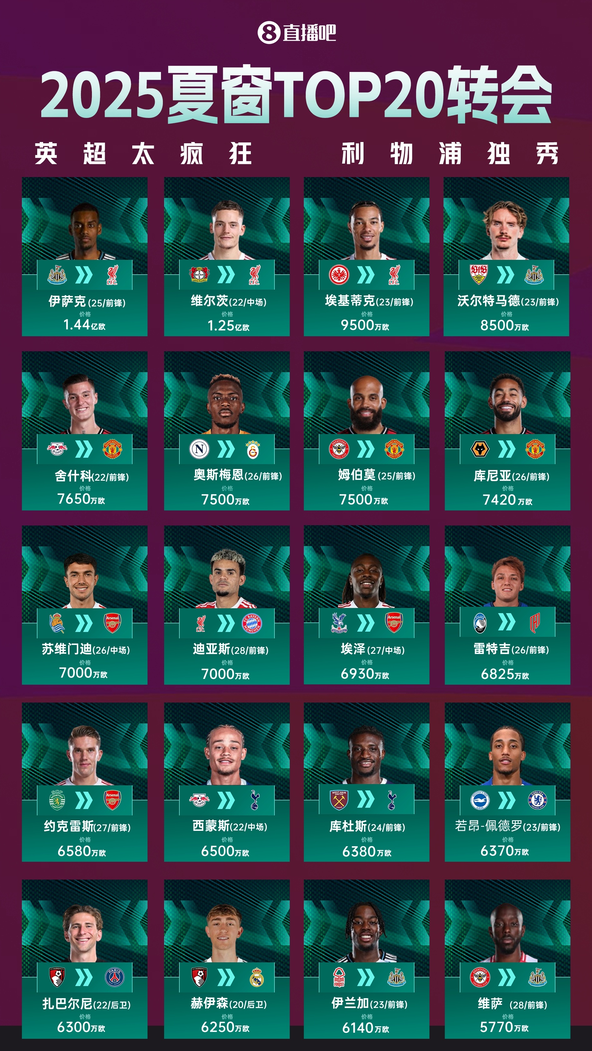 夏窗top10验货!维尔茨1.25亿10场1助 舍什科8场2球 迪亚斯6球4助