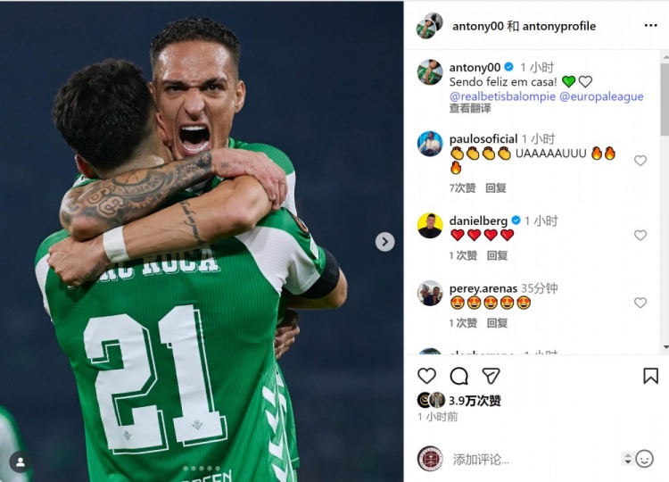 安东尼赛后在外交媒体上晒出庆祝进球的相片,配文:“在主场取胜太开心了!”