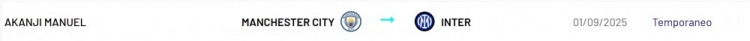阿坎吉从曼城加友邦米,来往形势清晰为租出,据此前罗马诺报说念称,这笔来往为200万欧租出费+1500万欧买断费。