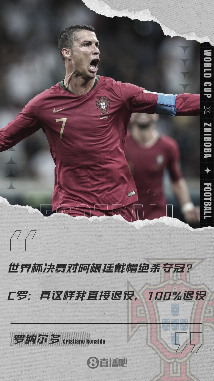 之后C罗还默示若天下杯决赛对阵阿根廷戴帽夺冠,100%退役。