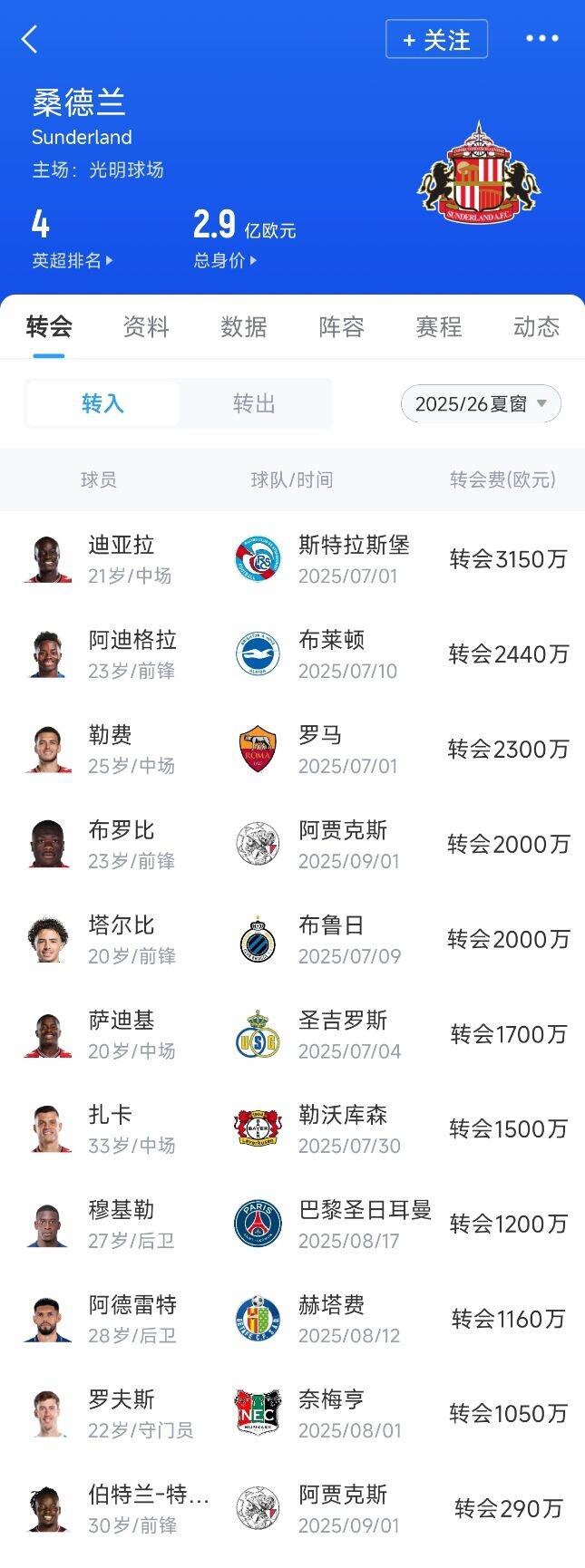 黑猫发威!桑德兰夏窗豪掷1.9亿旋乾转坤 斩蓝军平枪手排行欧战区