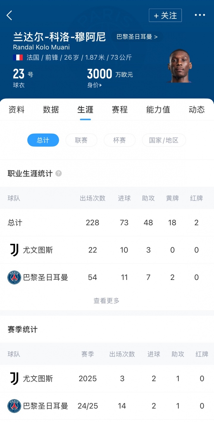 穆阿尼现年26岁,法国前卫。穆阿尼2023年夏窗9500万欧元从法兰克福加盟巴黎,上赛季被巴黎租出至尤文图斯。遵循尤文时辰球员出场22次,孝敬10球3助。现在穆阿尼德回身价为3000万欧元。