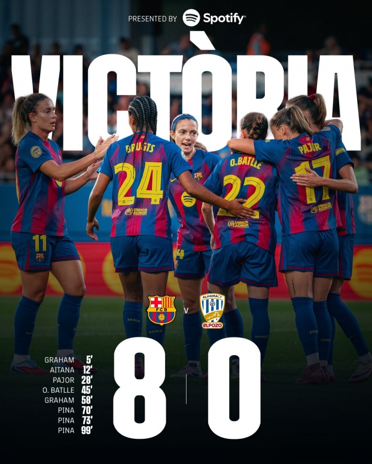 8月31日讯 西甲女足首轮,巴萨女足8-0大捷升班马阿尔哈马,顺利获得开门红。克劳迪娅-皮纳献艺帽子戏法,格雷厄姆-汉森梅开二度,此外艾塔娜、帕若尔和奥娜-巴特列也各有斩获。