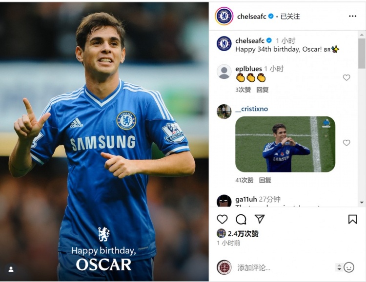 切尔西官方社媒晒出奥斯卡遵守球队时刻的像片,配文:“祝奥斯卡34岁诞辰随和!”