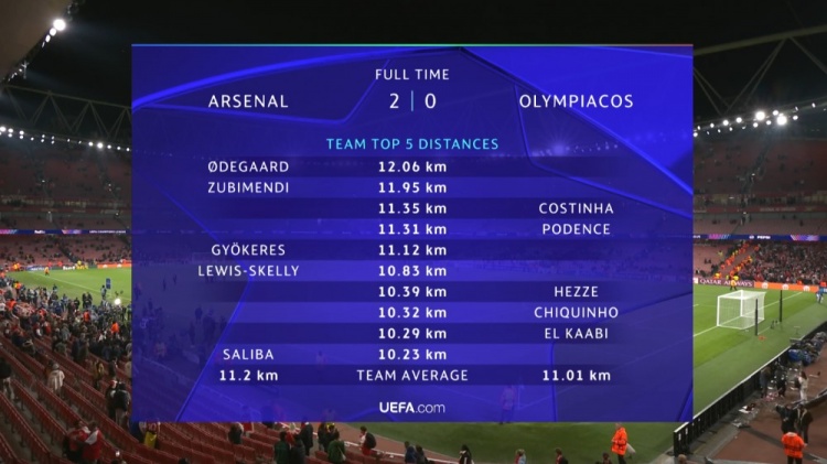 本场比赛阿森纳球员跑动距离最长情况如下: