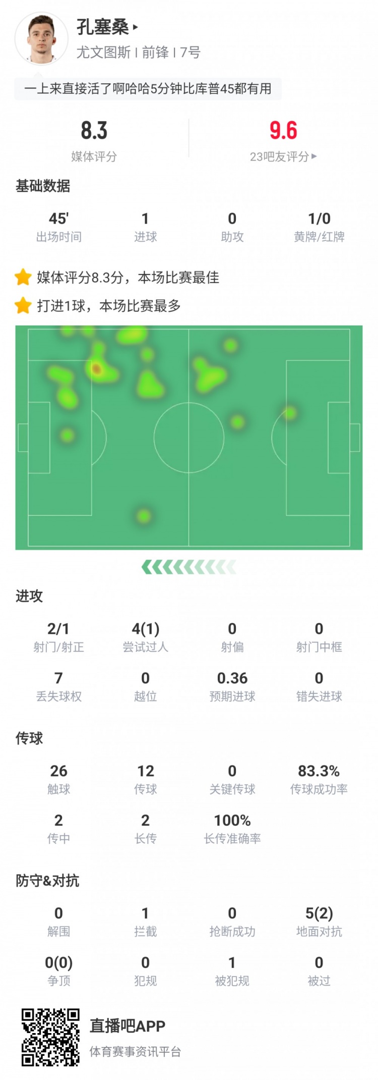小孔塞桑本场数据:下半场替补出场打进1球,评分高达8.3分