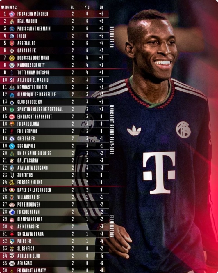 拜仁官推晒两轮事后欧冠积分榜:拜仁以进球上风领跑,皇马次席