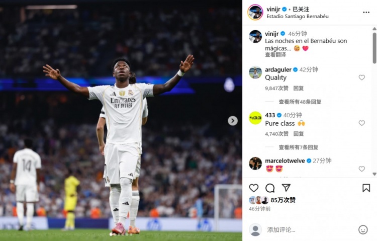 双响立功!维尼修斯晒照庆祝收效:在伯纳乌的神奇夜晚😉❤️