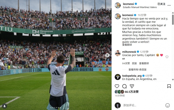 11月13日讯 梅西发布社媒,感谢了今天在埃尔切不雅看我方磨练的球迷们。