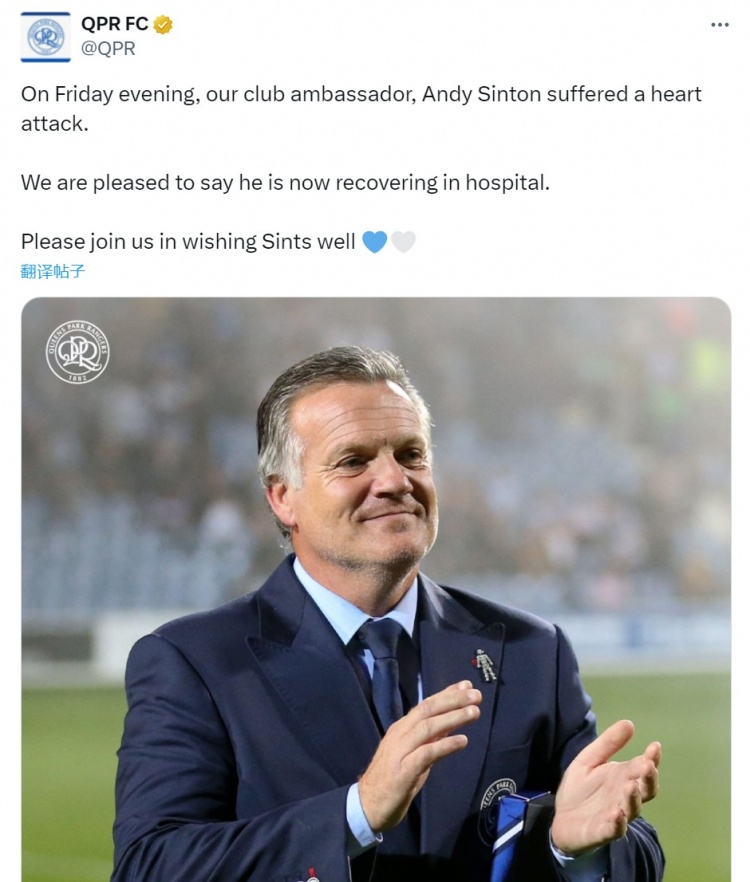 QPR官方写说念:“上周五晚间,咱们的俱乐部大使安迪-辛顿突发腹黑病。咱们很欢悦地秘书他当今正在病院康复。请和咱们一同祈福辛顿一切成功。”
