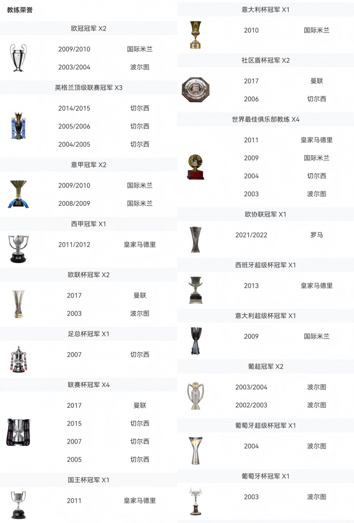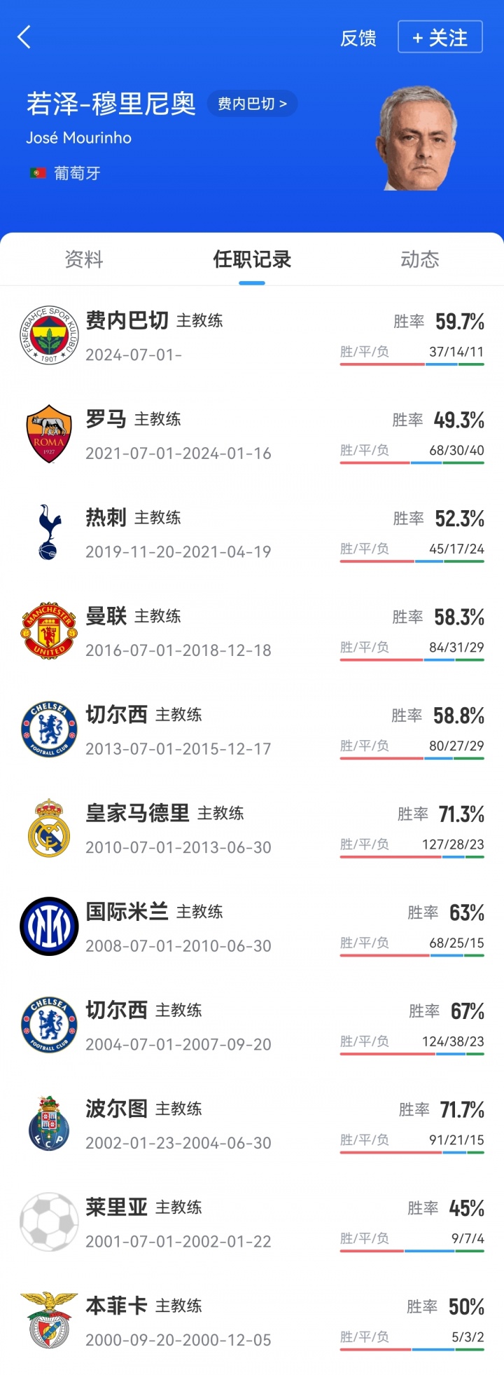 穆里尼奥现年62岁,持教生计从葡萄牙体育起步,历任本菲卡、莱里亚、波尔图、切尔西、国米、皇马、切尔西、曼联、热刺、罗马和费内巴切主帅,他的下一站是哪儿?
