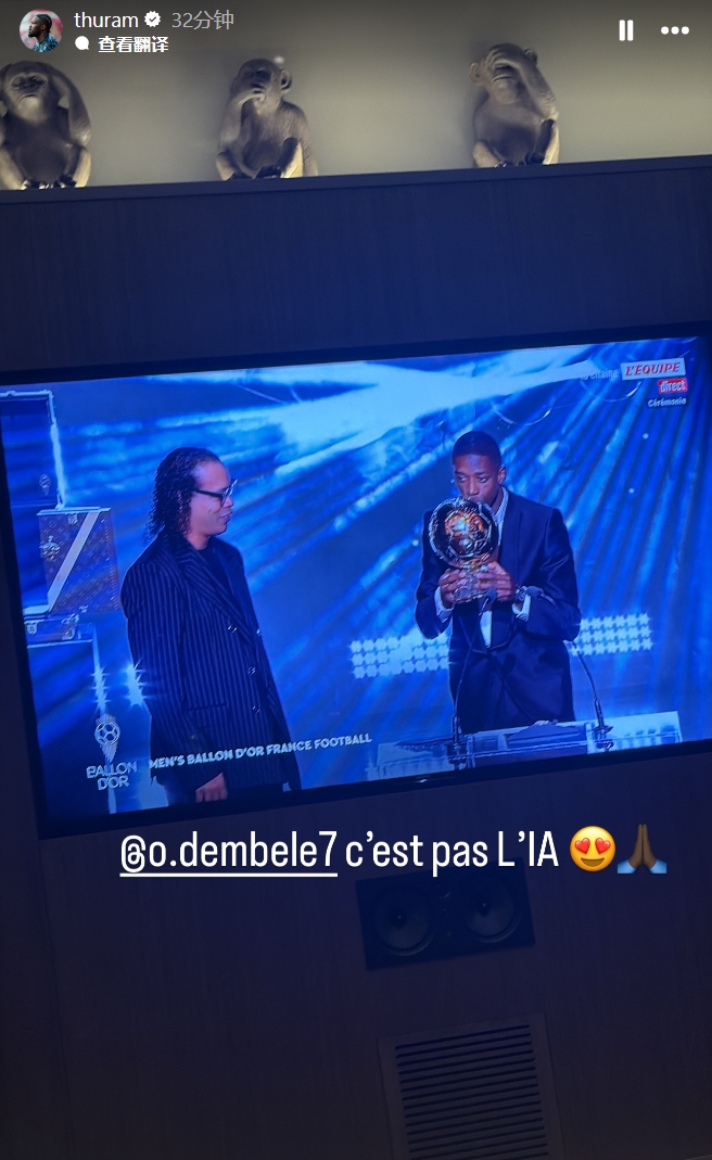 小图拉姆在家看登贝莱取得金球奖,晒照配文:这不是AI生成的😍