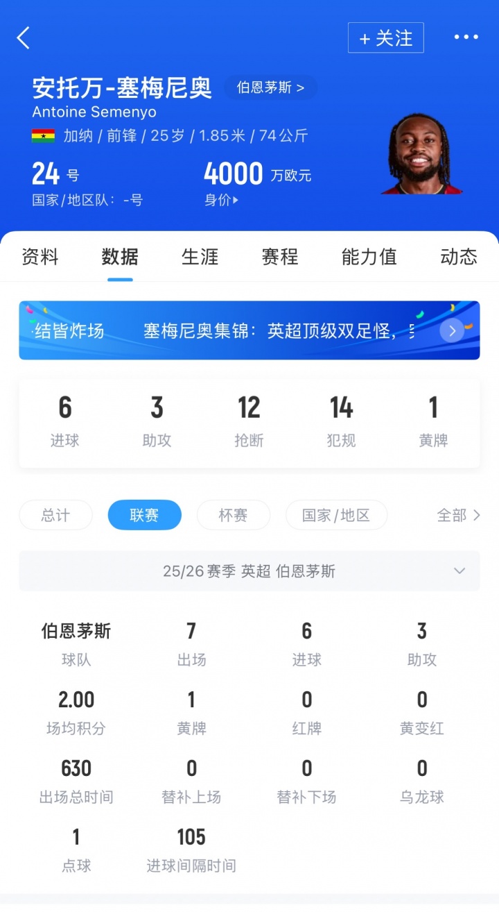 而伯恩茅斯方面以为,现年25岁的塞梅尼奥如今至少值7500万镑,本赛季于今,他也曾斩获6个联赛进球,并孝顺3次助攻。