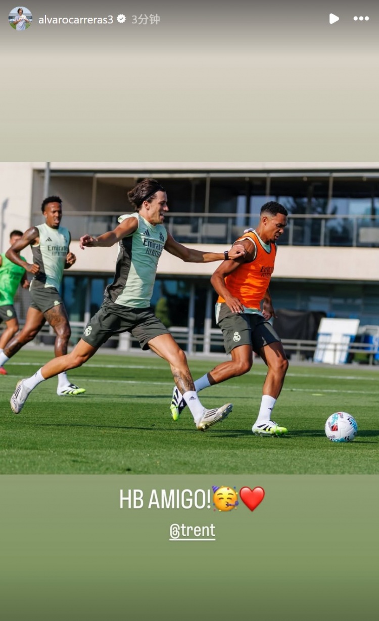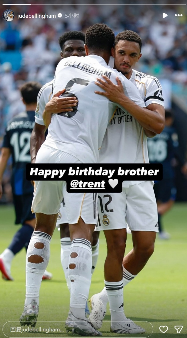 10月7日讯 今天是阿诺德27岁诞辰,皇骑兵友贝林厄姆、卡雷拉斯也纷繁在社媒晒出与阿诺德的合照为其奉上诞辰祈福。