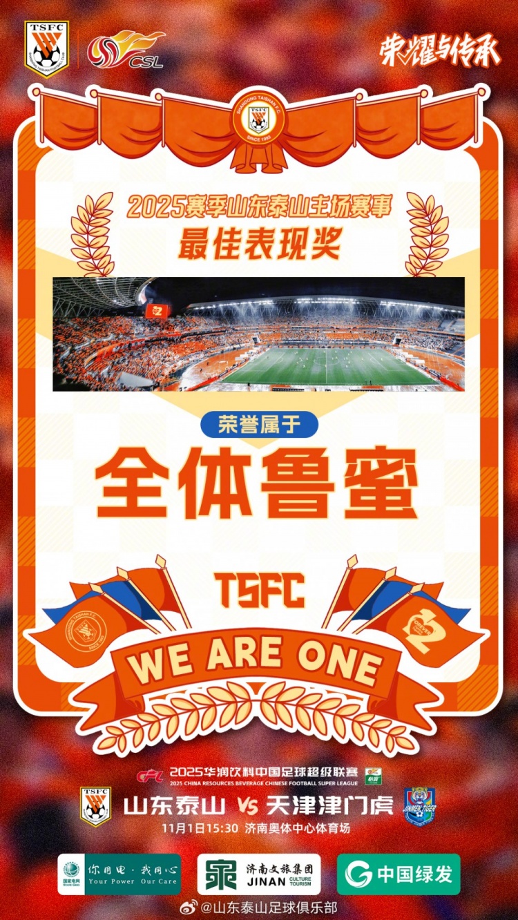 在本赛季主场收官战前,山东泰山俱乐部官方发布海报,将本赛季山东泰山主场赛事最好默契奖予以整体鲁蜜。