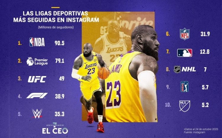 直播吧11月7日讯媒体ELCEO报谈,他们汇总了各个体育定约的粉丝排名,其中NBA位居各人最受宽宥体育定约榜首,他们ins共领有9050万名粉丝,排名第一。其次是英超联赛,粉丝数为7910万;终极格斗冠军赛(UFC)以4900万名粉丝位列第三。