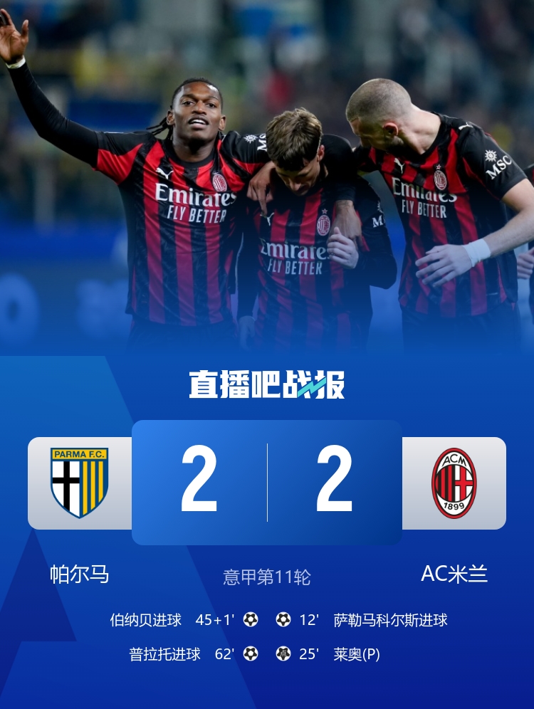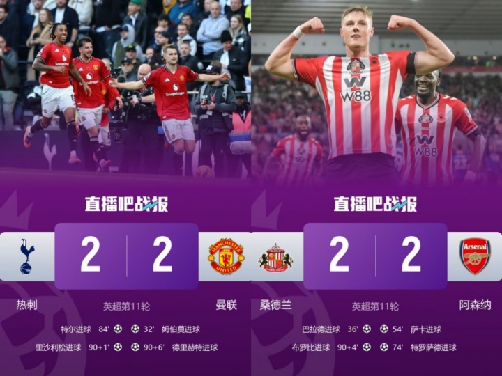 11月09日讯 本轮进行的意甲/英超比赛中,米兰2-2战平帕尔马、曼联2-2绝平热刺,阿森纳2-2被桑德兰绝平。