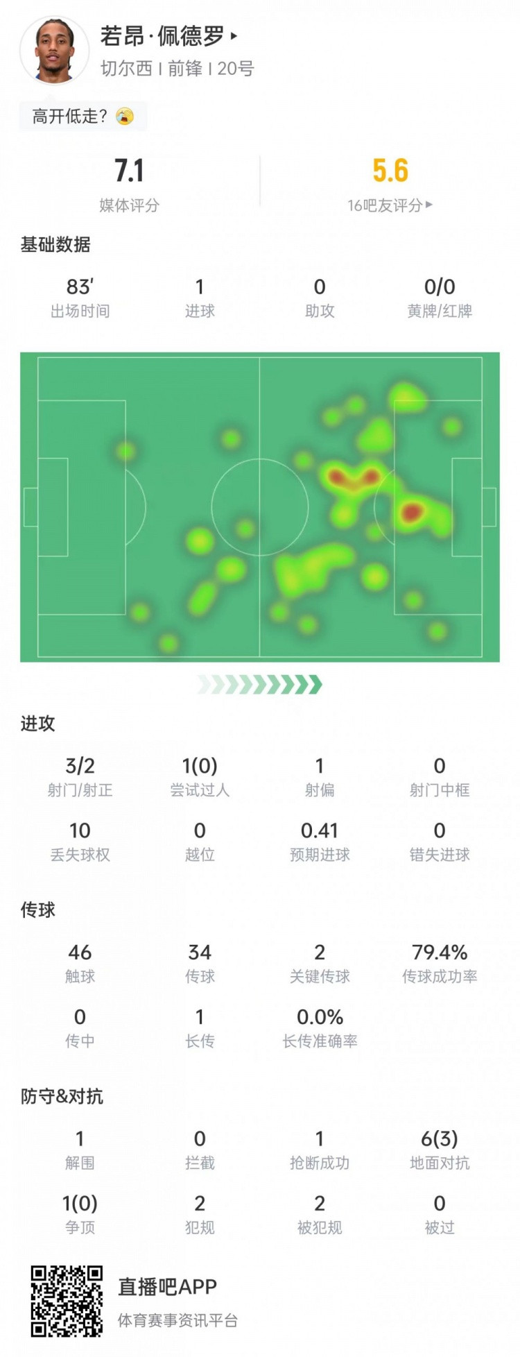 若昂-佩德罗数据: 3次射门打进1球, 送出2记要津传球, 获评7.1分