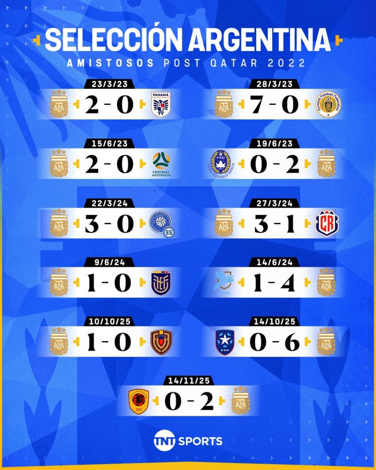 据TNT统计,2022年卡塔尔全国杯之后,阿根廷队插足11场友谊赛,沿途取胜。