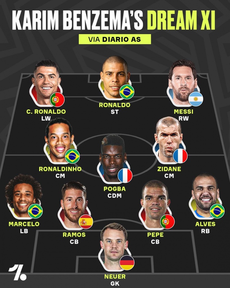 11月20日讯 日前在接纳《阿斯报》采访时,前法国国脚、前皇马先锋、2022年金球先生本泽马评比出我方心目中的足坛历史梦境11东谈主阵。其中,梅西、C罗、大罗三东谈主领衔锋线,小罗、都达内、博格巴镇守中场。
