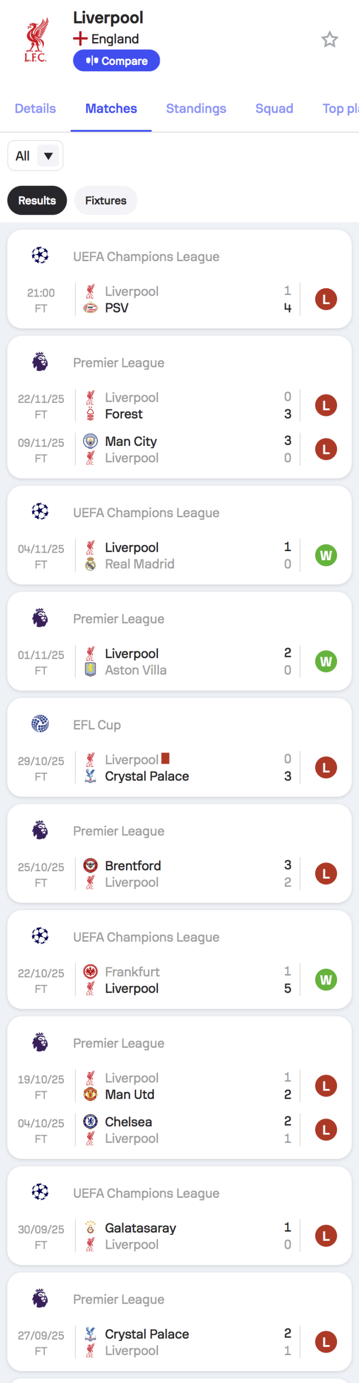 近2个月利物浦各项赛事共9次输球, 五大联赛同时最多