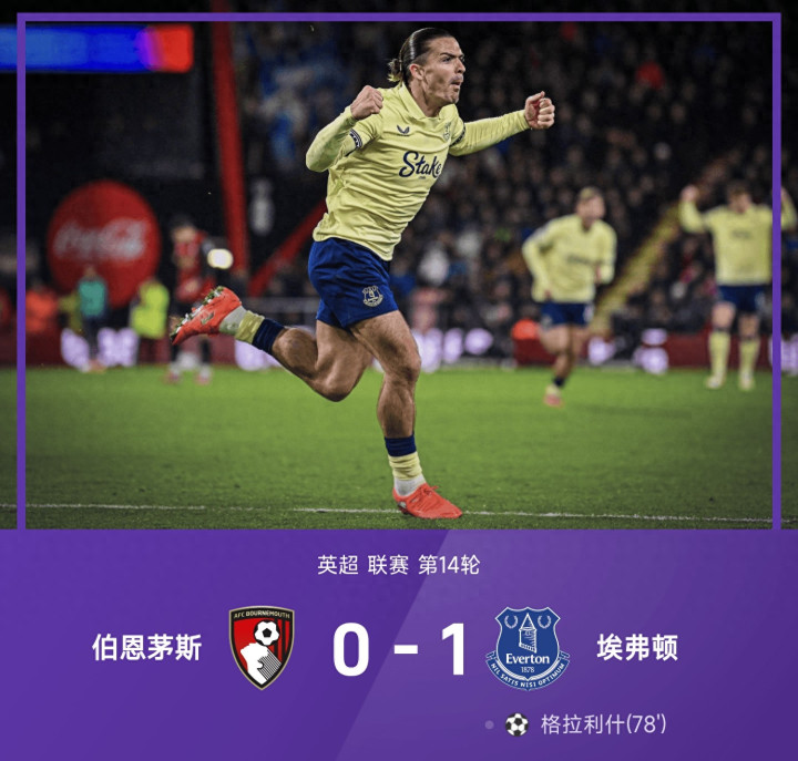 12月03日 25/26赛季英超联赛第14轮,埃弗顿1-0投诚伯恩茅斯。全场比赛,格拉利什下半场抽射变线破门打入惟逐一粒进球,上半场补时阶段克鲁皮进球被吹越位在先无效,塞梅尼奥造险,埃弗顿队史英超初度在客场打败伯恩茅斯,伯恩茅斯本赛季主场的不败金身告破。