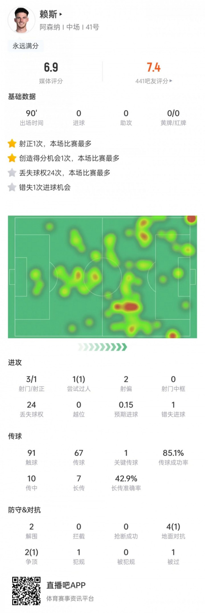 巴萨领跑西甲 赖斯本场数据: 丢球权24次全场最多, 6次抗击2次奏效, 获评6.9分