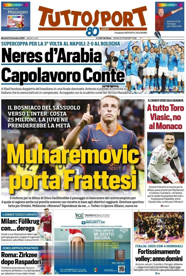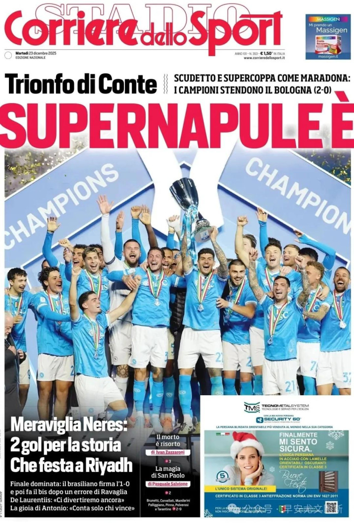 超等那不勒斯:孔蒂奏凯。联赛冠军和一座意大利超等杯,就像马拉多纳相通:联赛冠军2比0,把博洛尼亚晾在外面。伟大的内雷斯:两个进球创造记载,利雅得的精彩派对。主管了决赛:巴西东说念主1比0先拔头筹,然后行使拉瓦利亚的造作打进第二球。德劳伦蒂斯:“咱们再次踢得推动了。”孔蒂的痛快:“得手才是最繁重的。”