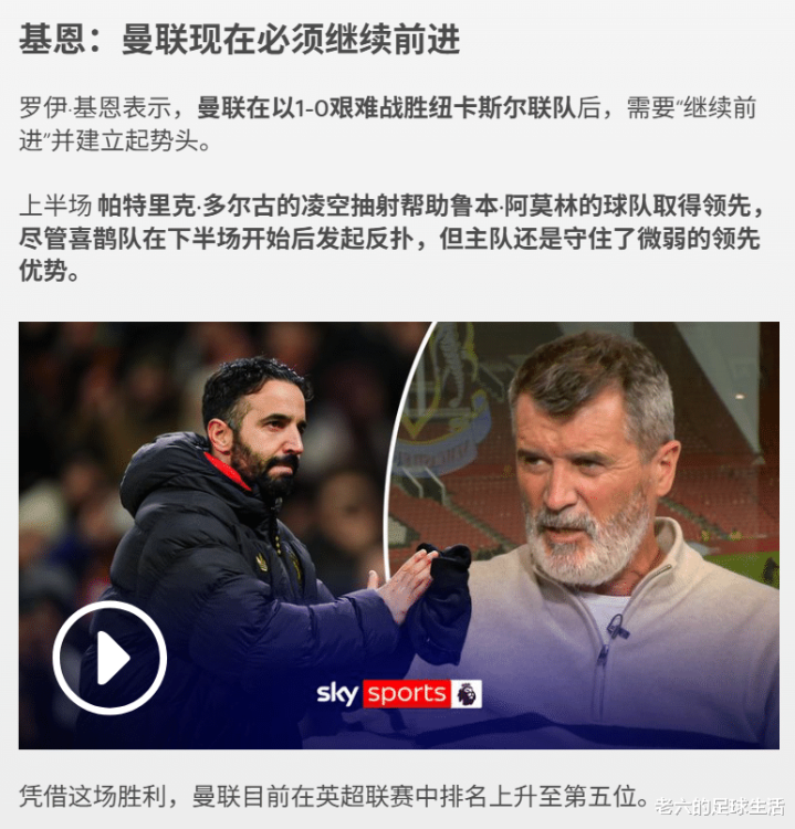 曼联上场比赛最终是1-0劳作顺服了纽卡斯尔联,赛后批驳员罗伊·基恩表态他们固然比赛的举座推崇并不颜面,但球队现时必须前进,努力图取好收成。