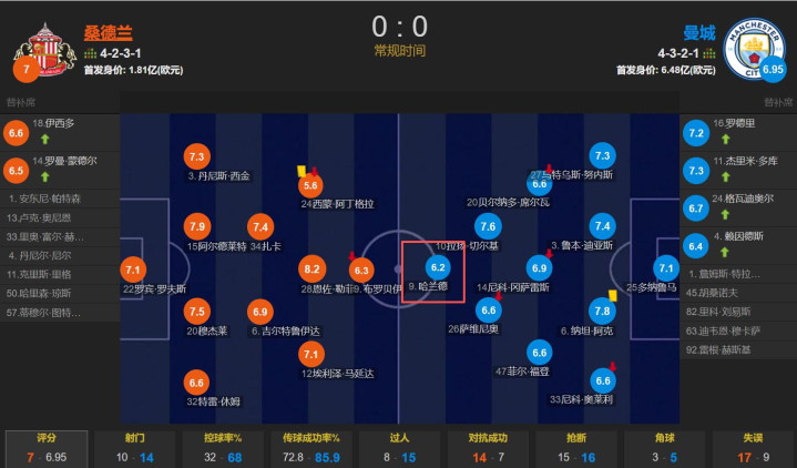 曼城0-0桑德兰,哈兰德首发出战踢满全场哑火,赛后获取6.2分。