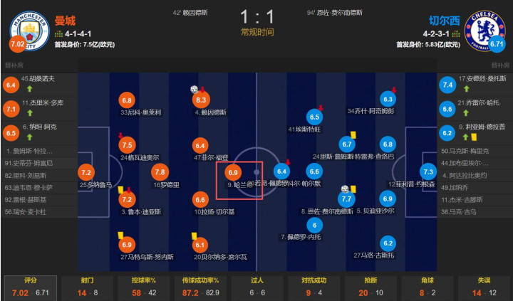 曼城1-1切尔西,哈兰德首发出战踢满全场哑火,赛后获取6.9分。