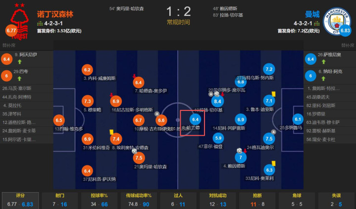 曼城2-1诺丁汉丛林,哈兰德首发出战踢满全场哑火,赛后获取6.4分。