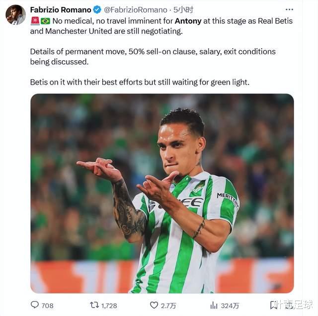 4点11分:巨擘记者罗马诺发文称,莫得体检,莫得出行筹划,安东尼转会仍在僵局。贝蒂斯在恭候曼联和安东尼之间的辩论(薪水抵偿问题)。